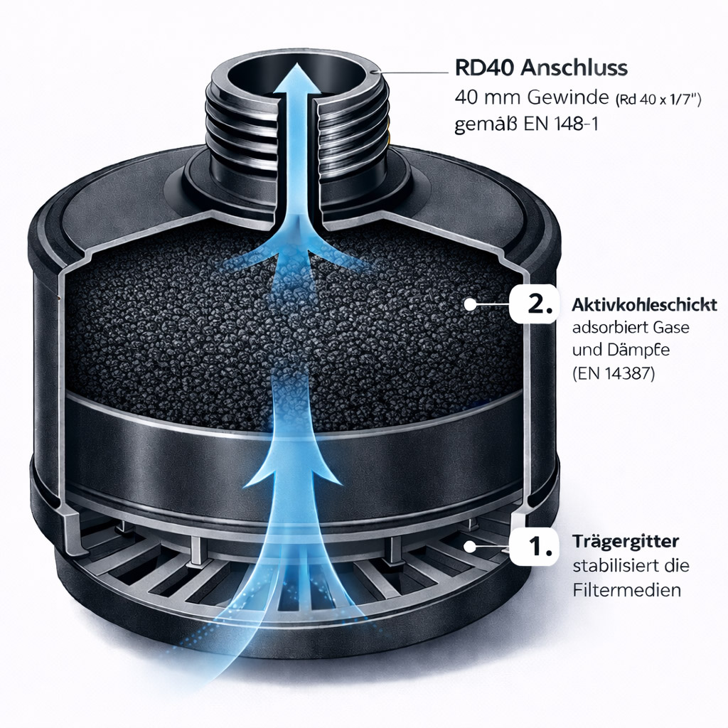 Grundsätzlich bestehen Gasfilter aus einem Filtergehäuse, einen Lufteinlass, einem Luftauslass zur Atemschutzmaske und einem Filtermedium, der Aktivkohle.