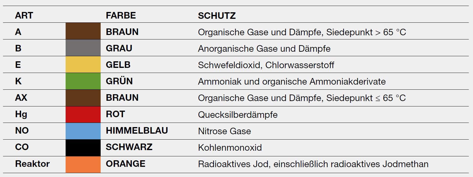 ABEK-Filter = Mehrbereichsfilter für organische Substanzen mit einem Siedepunkt > 65° C, Anorganische Gase und Dämpfe, Schwefeldioxid, Chlorwasserstoff, Ammoniakund organische Ammoniakverbindungen