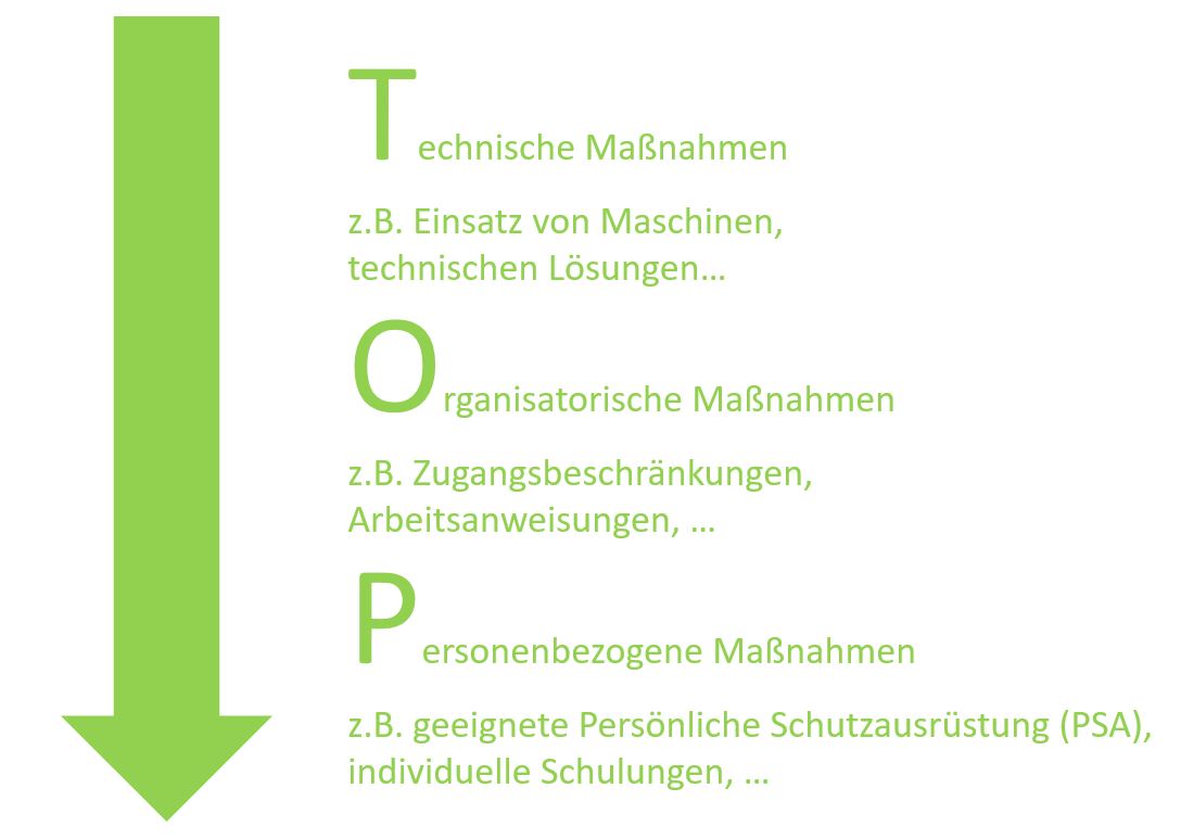 Dabei sind gemäß dem TOP-Prinzip technische oder organisatorische Maßnahmen denen des individuellen Schutzes vorzuziehen (eine Absaugvorrichtung hat also Vorrang vor dem Einsatz von Atemschutzmasken).